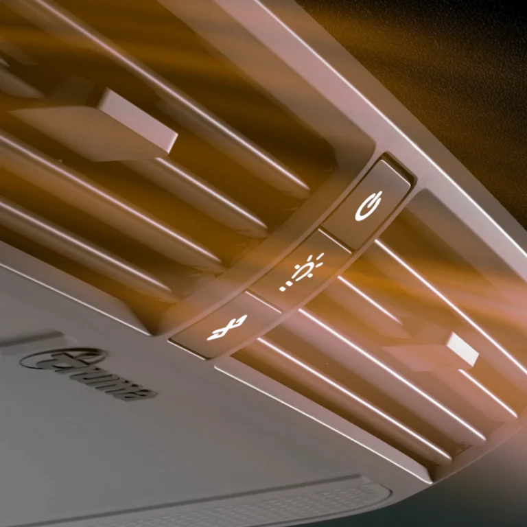 Der besonders flach gestaltete Innenluftverteiler der Dachklimaanlage erhält nahezu die ursprüngliche Fahrzeughöhe. Die Luft lässt sich flexibel nach oben und unten sowie nach vorne und hinten verstellen; beim Premium‑Luftverteiler sogar zusätzlich seitlich. Außerdem bietet die Premium-Variante eine angenehme LED-Beleuchtung.